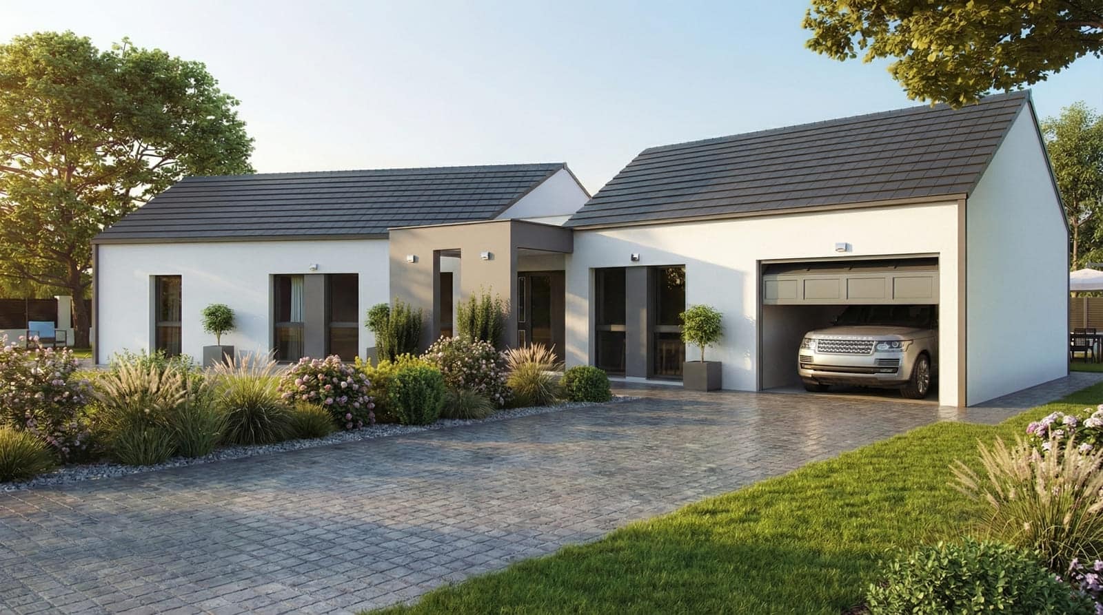 Cette maison contemporaine en V proposée de 95m² à 125m² comprend de 3 à 4 chambres et un garage accolé !